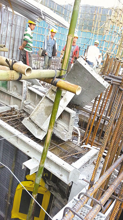 ■慘遭鋼筋貫體工人失足墮樓之處有多條鋼筋。 記者劉友光 攝