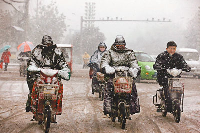 ■13日,行人在山東菏澤市區中華路冒雪行進。新華社