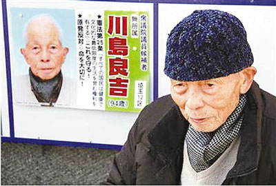 曾參與侵華戰爭的94歲老兵川島良吉為了反對極右主義,不惜耗盡300萬日圓(約27.8萬港元)棺材本參選,惜只能在所屬埼玉縣選區獲得2,169張選票,不足總票數10%,全數參選按金被沒收,血本無歸。