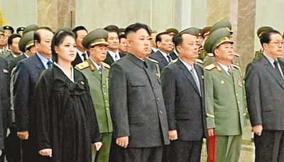 朝鮮已故最高領導人金正日昨逝世一周年,安放遺體的平壤錦繡山太陽宮舉行開放儀式。最高領導人金正恩(前排右三)與妻子李雪主(前排左),以及黨政軍高層共同參拜。朝鮮全國昨午12時汽笛長鳴,全民默哀3分鐘悼念。