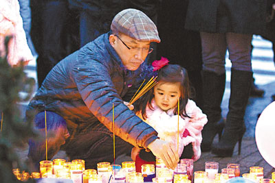 ■有亞裔民眾帶同女兒為遇難者點香。路透社
