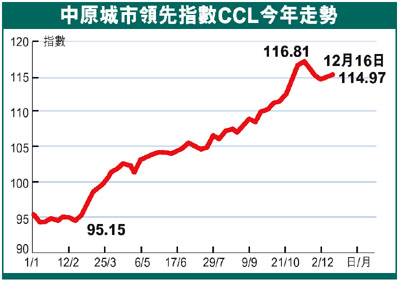 ¡@»´ä¤å¶×³ø°T¡]°OªÌ ¶À¹Å»Ê¡^Âù»¶©Û¥X¥x±Nªñ¨âÓ¤ë¡A¥«³õ¶}©l®ø¤Æ¦³Ãö®ø®§¡A¼Ó»ù¥ç¤éº¥¯¸Ã°}¸}¡A¤î¶^¦^¤É¡C¤¤ì«°¥«»â¥ý«ü¼Æ(CCL)³Ì·s³ø114.97ÂI¡A²Öp¤É0.52%¡A«ö©P¤W¤É0.35%¡A³s¶^¤T©P«á³s¤É¨â©P¡C