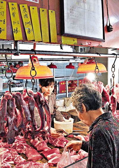 ■受天氣影響,蔬菜價格繼續呈現季節性上漲,豬肉價格亦持續上升。圖為廣州某市場肉檔一隅。 資料圖片