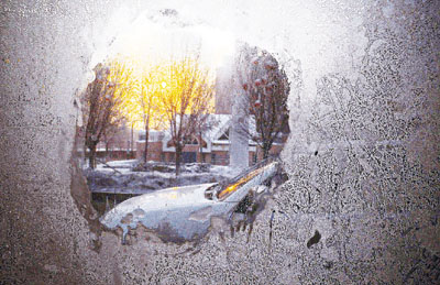 ■連日來新疆烏魯木齊持續零下20多度的低溫天氣,風吹雪困數百車。圖為烏市一民眾從車內拍攝車外景象。中新社