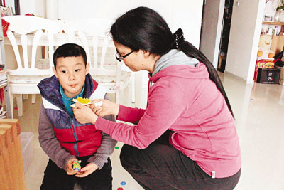 這時,7歲的小滔正跪在地板上,專注地擺弄著他最喜歡玩的雪花片,玩著玩著就發出了笑聲。媽媽蹲在他身邊餵他吃橘子,他只瞥了媽媽一眼,又接著玩了。母子近在咫尺,卻彷彿隔著最遙遠的距離。