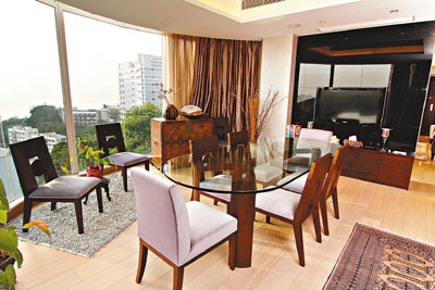 飯廳放置一張玻璃製的大餐桌,配合弧形落地玻璃窗,一室透視感。