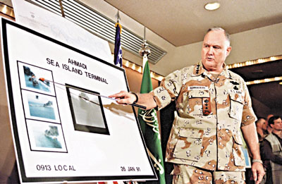 ■海灣戰爭期間,施瓦茨科普夫講解美軍戰術。資料圖片