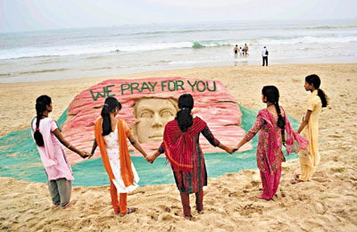 ■少女在沙灘為強姦案受害者祈禱。新華社