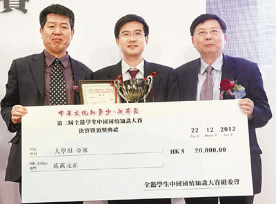 大學組亞軍冼一帆(中),由紀建軍(左)及楊耀忠(右)頒獎。 黃偉邦 攝