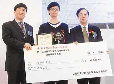 中學組季軍王陸奇(中),由張建華(左)及俱孟軍(右)頒獎。 黃偉邦 攝