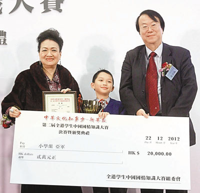 小學組亞軍關毅博(中),由朱蓮芬(左)及李少鶴(右)頒獎。 黃偉邦 攝