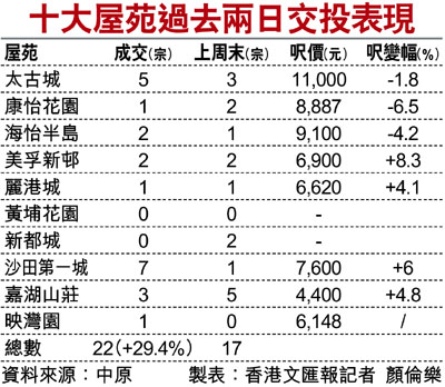 香港文匯報訊(記者 顏倫樂)踏入2013年,股市造好,加上有新盤準備開售,刺激樓市交投氣氛,令二手交投表現回暖。中原地產統計,過去兩日十大屋苑錄得22宗成交,比上周再升5宗,升幅29.4%。
