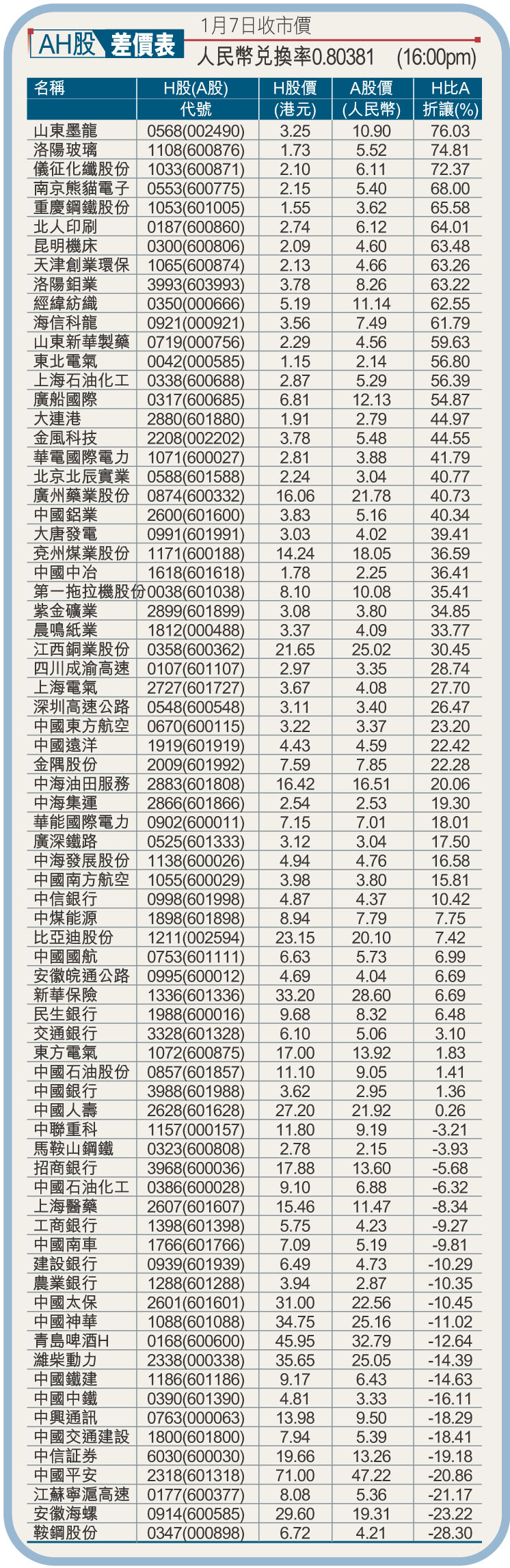 AH股差價表(1月7日收市價) (2013-01-08) (圖)
