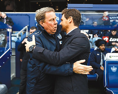榜尾的昆士柏流浪昨晚英超主場悶和賽前排第3的熱刺0:0,上月接掌昆流的哈利列納(左)在舊會身上取得1分,賽前與熱刺主帥波亞斯互相擁抱,化解賽前罵戰的恩怨。路透社