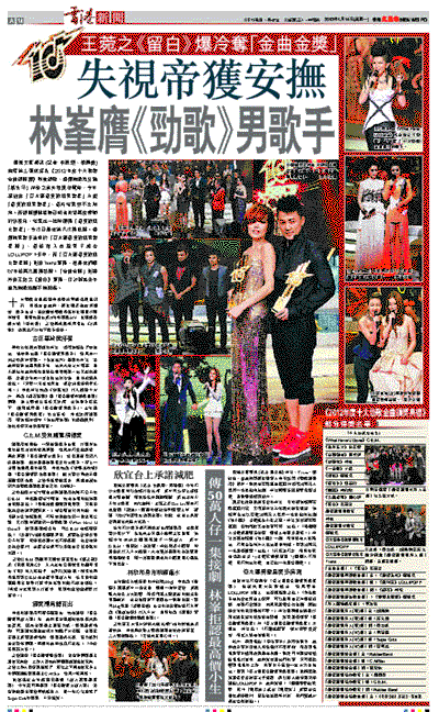 香港文匯報訊 (記者 李思穎、梁靜儀) 樂壇第三張成績表《2012年度十大勁歌金曲頒獎禮》昨晚頒發,盛傳無線為安撫「親生仔」林峯之前失落視帝寶座,今年讓他由「亞太區最受歡迎男歌星」升做「最受歡迎男歌星」,最終結果亦不出所料。而頒獎禮開場時已明言希望再度蟬聯的容祖兒,結果也一如所願得「最受歡迎女歌星」,今次已是她第八次得此獎。盛傳無男歌手肯拿的「亞太區最受歡迎男歌星獎」,最後落入台灣男子組合LOLLIPOP F手中,而「亞太區最受歡迎女歌星獎」則由Twins奪得,這是她們繼07年後再次贏得該獎。「金曲金獎」則爆冷由王菀之《留白》奪得,估計與其去年曾為無線拍劇不無關係。
