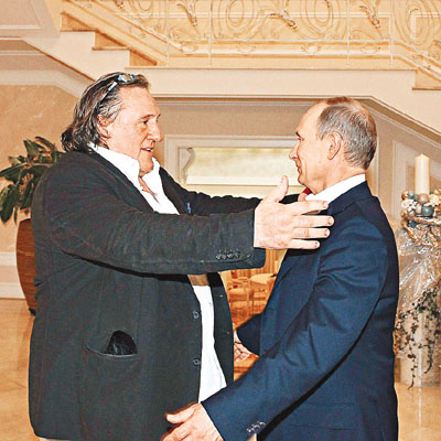 ■「大鼻子情聖」謝勒狄柏度因反對富人稅,放棄護照入籍俄羅斯,並與俄總統普京擁抱。資料圖片