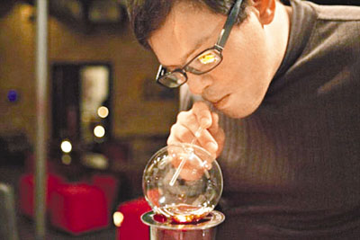 Vaportini 2009年由芝加哥人帕爾默發明,裝置包括一個有小孔的玻璃球、玻璃飲管及可放蠟燭的玻璃杯底座。將一小杯酒倒入玻璃球內,加熱至攝氏60度,便會產生酒精霧。有用家形容,酒精霧「溫溫的,味道不減,能帶來極強但短暫的刺激」。 ■霍士電視台/《每日郵報》