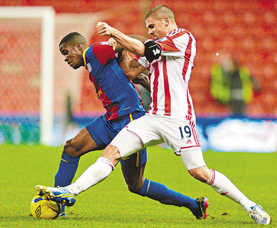 ■禾達斯(右)與水晶宮新星韋費特沙夏(左)角力。 法新社