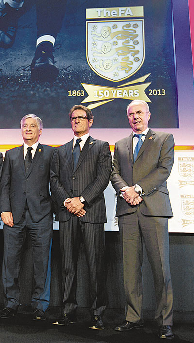 ■(左至右)足總主席伯恩斯坦、卡比路與艾歷臣在金色150周年足總會徽前合照。美聯社
