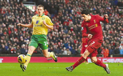 老牌勁旅利物浦當天迎來大勝。新加盟的史杜歷治與蘇亞雷斯本賽季第一次聯袂正選,顯示出強大攻擊力,幫助「紅軍」5:0擊退諾域治。 ■香港文匯報記者 梁啟剛