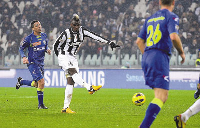 ■保羅普巴(右)勁射破門。路透社