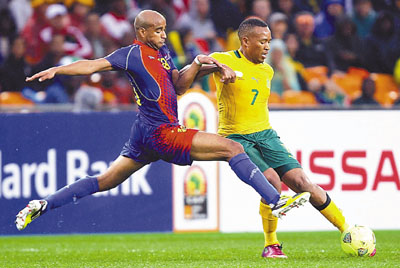 非洲國家盃足球賽昨日在南非開鑼,A組兩場賽事都踢成0:0。東道主南非(圖右),先在揭幕戰,同佛德角互交白卷。另一場比賽,摩洛哥同安哥拉亦以0:0完場。 ■路透社