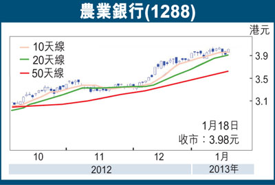 另一方面,農行於2010年7月上市時,招股價為3.2元(港元,下同),當時引入多個策略投資者而非創始股東,故外資大戶及散戶入貨價相同,也因為市場沒有「平貨」,令該股以往炒上時往往遇到的阻力較小。在股價向好之勢已成下,預計該股中長線目標可望有力挑戰上市高位的4.85元。