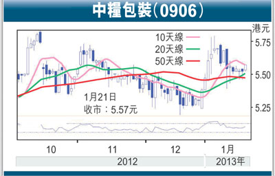 雖然多月來,圍繞中糧包裝的消息並不多,惟觀乎該股於本月初卻現異動,由12月中旬低位的5.19元,三扒兩撥衝高至的5.79元始見遇阻,而近日股價主要呈窄幅上落為主,昨收5.57元,升0.05元或0.91%。就技術走勢而言,該股經過昨日的上升,已令10天線失而復得,其20天線亦已成功升破50天線,平均線組合排列也得以呈強。在市場熱錢對行業龍頭股情有獨鍾下,中糧包裝尚未發力,所以不妨加以留意。