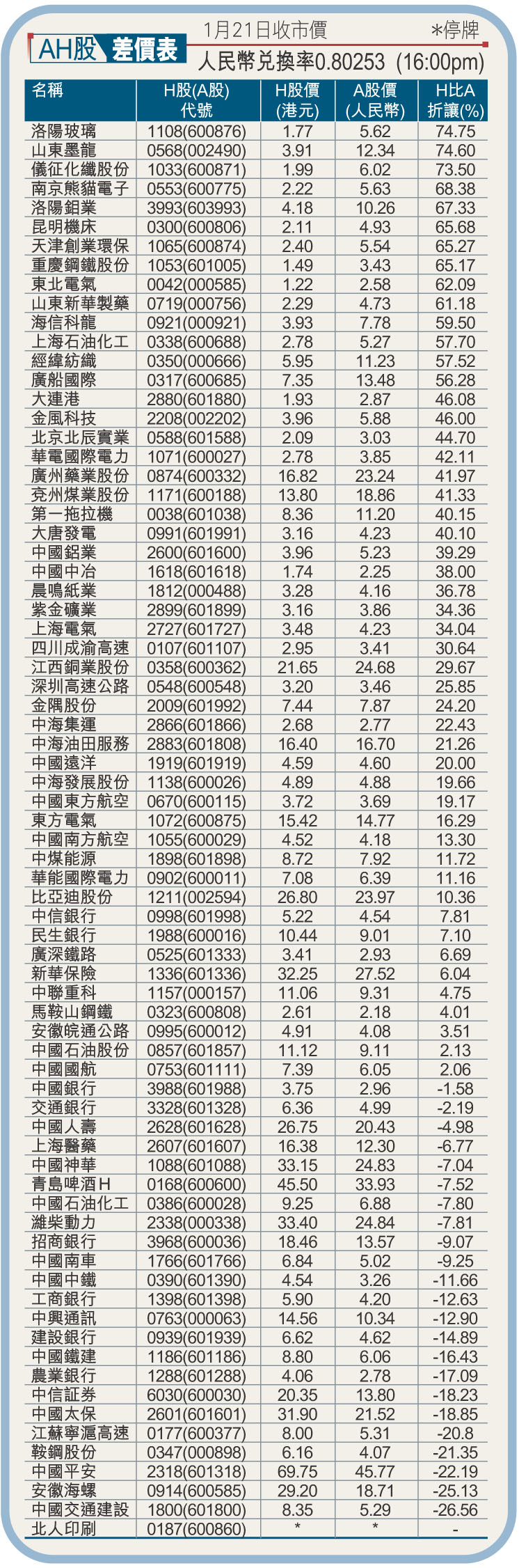 AH股差價表(1月21日收市價)*停牌 (2013-01-22) (圖)