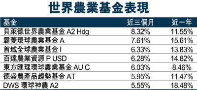 據基金經理表示,由於穀物價格與板塊股的關連高,使得孟山都、Mosaic及林賽等龍頭股上季盈利出現超出15.86%至73.67%不等的市場預期,當中孟山都和林賽盈利年增長率更是分別達到170%與400%。