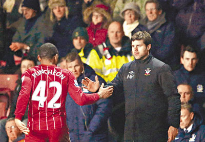 阿根廷籍領隊普捷天奴(右)上任後首戰,修咸頓在昨晨英超浪費了不少機會,主場與第5位的愛華頓互交白卷,續守在倒數第6位。 ■路透社