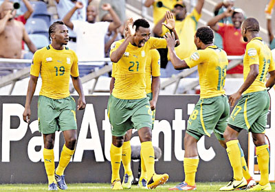施耶邦加(左二)為東道主南非破球荒,協助球隊在非國盃A組次輪贏2:0,取得他們9年來在這錦標的首場勝仗,暫以1勝1和列小組榜首。 法新社