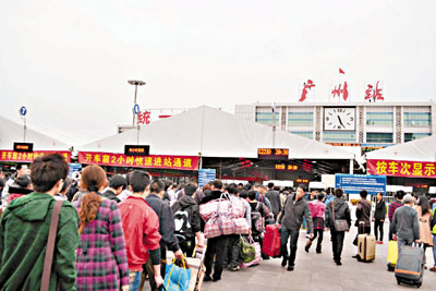 為應對高峰期旅客候車、進站,廣州火車站廣場搭建起7,200平方米的臨時雨棚。進站旅客實行切塊分流,按方向、區段、車次、時間候車。又充分利用售票廳,將安檢儀位置移動,以擴大候車緩衝面積,藉此加快旅客進站安檢速度,同時也能確保進站上車的旅客全部接受安全檢查。