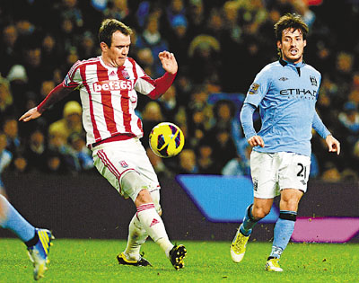 ■曼城中場大衛施華(右)跟史篤城中場格連韋倫過招。 法新社