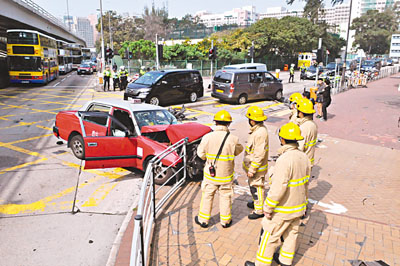 香港文匯報訊 (記者 劉友光) 油麻地加士居道與衛理道十字路口發生驚險交通意外,一輛客貨車司機疑將左轉綠燈當作直去綠燈開行,當場與一輛的士發生相撞,2車司機受傷外,更連累的士上3名男女乘客無辜受傷被困,其中1名女乘客一度暈倒,幸各人經救治後傷勢均無大礙。