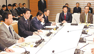■安倍(左二)與白川(右一)出席經濟會議。路透社