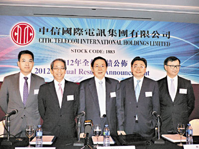 ■左起:中信國際電訊技術總裁張悅賓、行政總裁阮紀堂、主席辛悅江、財務總裁陳天衛和CPC行政總裁何偉中。卓建安 攝