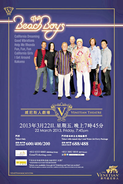 ■美國殿堂級搖滾樂隊Beach Boys(見圖)將於下月22日首度赴澳門舉行演唱會。