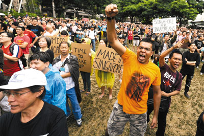 逾4,000名新加坡民眾昨參與示威(見圖),抗議政府日前發表的人口政策白皮書,提出引入更多新移民,認為會帶來房屋及交通等問題。有示威者稱,基礎設施已超負荷,政府要求將人口目標增至690萬,並無考慮民眾苦況,擔心拖累低收入及中產階層的薪酬。