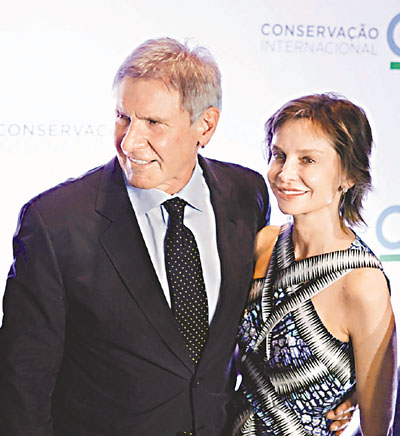 ■荷里活男星夏里遜福(圖左)前日出席非政府組織「保護國際」的會議,其妻子Calista Flockhart(圖右)素顏陪同出席。 路透社