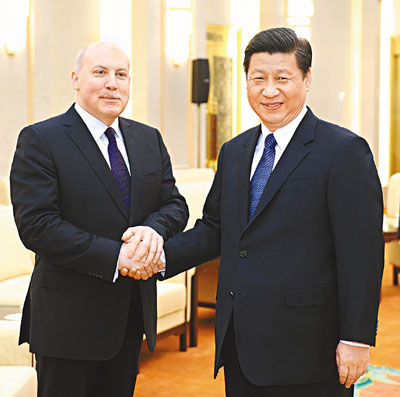 ■習近平昨日會見上海合作組織秘書長梅津採夫。新華社