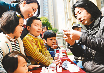 ■安徽省合肥市非遺傳承人武建付22日現場教授孩子們捏製「創意元宵」。當日,合肥市瑤海區金大塘社區開展「非遺鬧元宵」活動,邀請合肥市麵塑和泥塑非遺傳承人現場製作元宵主題作品。 新華社