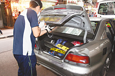 ■探員在九龍城道截獲的私家車內檢獲多個不同的車牌。