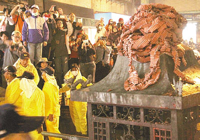 台灣慶元宵的保留節目:台北市鄰近內湖捷運站的福德祠,昨日舉辦有百年歷史的「夜弄土地公」儀式,吸引許多民眾手持相機或手機,拍攝鞭炮爆炸的那一瞬間。■中央社