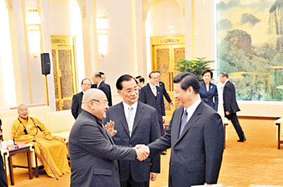 ■習近平(右)與台灣潤泰集團總裁尹衍樑握手,展現親和與自信。葛沖 攝