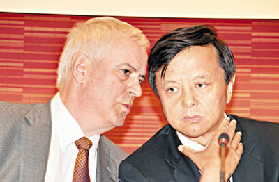 ■李小加(右)與倫敦金屬交易所行政總裁Martin Abbott密斟。香港文匯報記者張偉民 攝