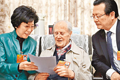 98歲高齡的全國政協委員、著名翻譯家沙博理(中)1963年加入中國國籍,自1983年獲任第六屆全國政協委員以來,一直連任至今。 新華社