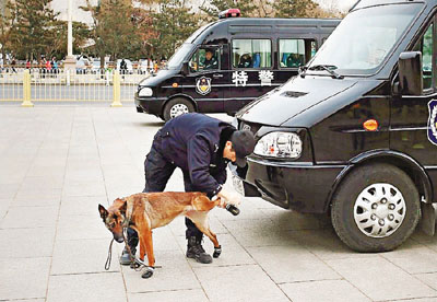 天安門廣場停車區的警犬全部「穿鞋」上崗。