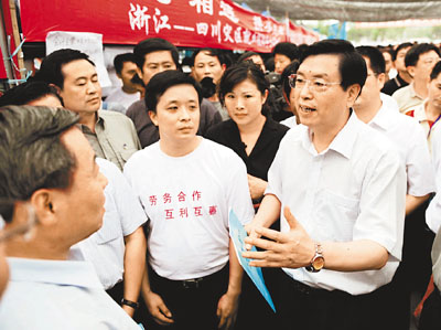 ■張德江在四川省都江堰市勞務輸出專場招聘會現場了解對口支援省市就業援助情況。