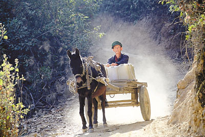 ■雲南大旱致215萬人飲水難。圖為一位居住在山上的村民駕騾車到山下池塘取水。 中新社